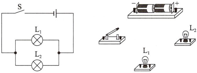 并联电路图:电源正极→开关→分支点→一条支路接灯泡L1,另一条支路接灯泡L2→汇合点→电源负极(用规范电路符号表示)