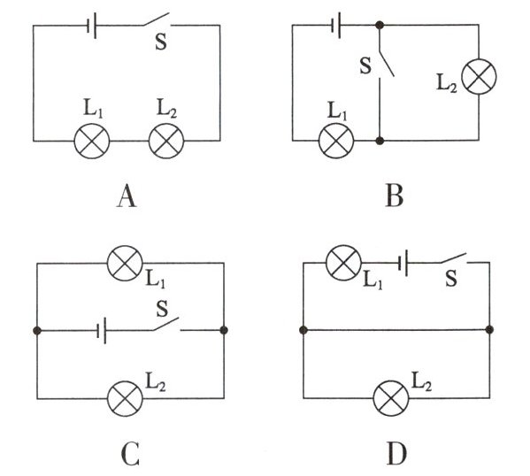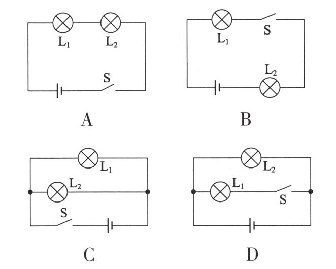 6. 如图所示,开关能同时控制两盏灯,且一盏灯的灯丝断了也不影响另一盏灯工作的电路是(