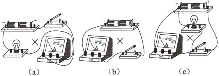 (a)正负接线柱接反;(b)直接接电源两极;(c)与用电器并联。