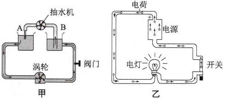 3. 利用类比的方法可以帮助我们理解电流的形成。图甲中,抽水机抽水,使A、B间水面形成持续的高度差,产生水压,形成从A到B的持续水流,推动涡轮转动。图乙中,电源供电时,使电源的一端聚集正电荷,另一端聚集负电荷,形成电压,使电源外部电路中电荷定向移动形成持续电流,使灯泡发光。