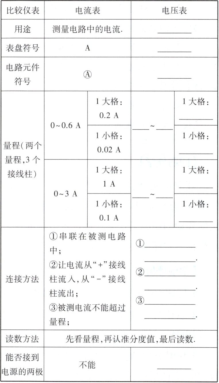 仔细观察电压表并认真阅读电压表的使用说明,了解电压表的使用规则,对照电流表的使用规则,将下表补充完整。