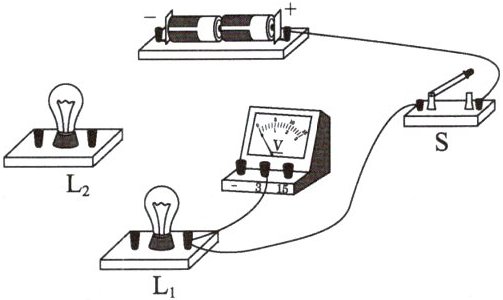 [典例2]请将图中的器材连接完整。要求:两灯串联,电压表只测$L_1$灯两端的电压。