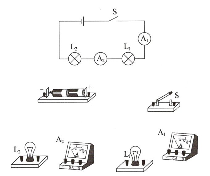 3. 请按照电路图,用笔画线表示导线连接相应的实物图(电流表$ A_1$和$ A_2$均用 0~0.6 A 的量程).