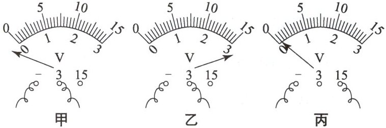 1. 在“练习使用电压表”的实验中,大梦收集了各实验小组出现的指针偏转的几种情况,如图所示。请你分别写出出现相关情况的原因。