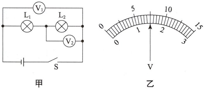 2. 小明按图甲的电路进行实验。闭合开关,用电器正常工作时,电压表$V_1$和$V_2$的指针完全一样,如图乙所示,则$L_1$的电压为