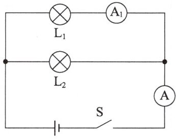 1. 如图所示,在探究并联电路的电流规律时,闭合开关S后,电流表A的示数是$0.4 A,A_1$的示数是0.1 A,则通过小灯泡$L_1$的电流为