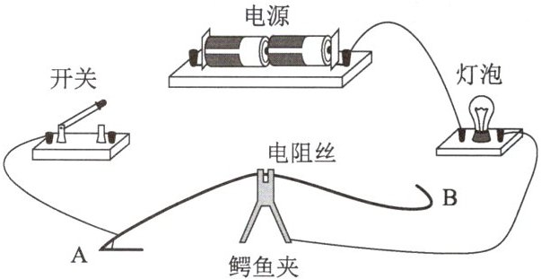 1. 用鳄鱼夹夹在电阻丝上,制成一个变阻器,接入如图所示的电路中。在电阻丝上滑动鳄鱼夹,改变灯泡的亮度。想一想:灯泡的亮度为什么会改变?