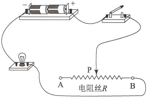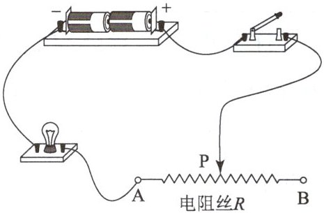 2. 如果电阻丝 $ R $ 接线柱连在了 $ A $ 处(如图所示),滑片 $ P $ 可以在电阻丝上来回滑动且与电阻丝相连通。闭合开关,要使灯泡亮些,滑片 $ P $ 应向哪边移动?为什么?