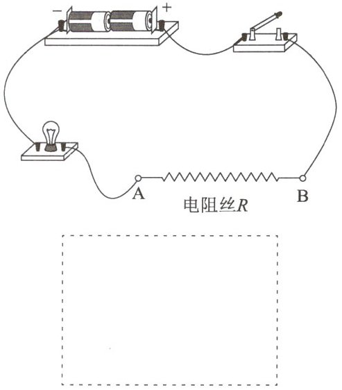 1. 在虚线框内画出如图所示实物电路的电路图。要使灯泡的亮度变大,需要使电阻丝的电阻如何变化?你能想出哪些方法使电阻丝的电阻发生变化?