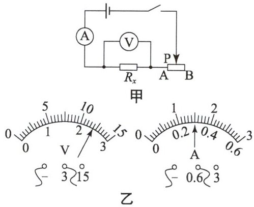 4. 如图所示,电源电压保持不变.小华按照如图甲所示的实验电路正确连接电路,进行实验.某次实验中电压表示数、电流表示数如图乙所示,则电阻$ R_x $的阻值是多少? (写出计算过程.)