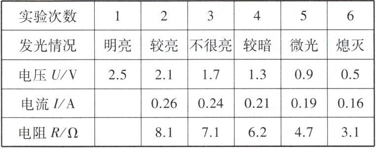 (2) 检查电路无误后,闭合开关,移动滑片,使电压表的示数为$ 2.5 $V,电流表示数如图乙所示,小灯泡正常发光,此时灯丝的电阻为______$ \Omega $.向______(填“左”或“右”)移动滑动变阻器滑片,小灯泡两端的电压逐渐下降,灯丝温度也不断降低,测量数据见表格.