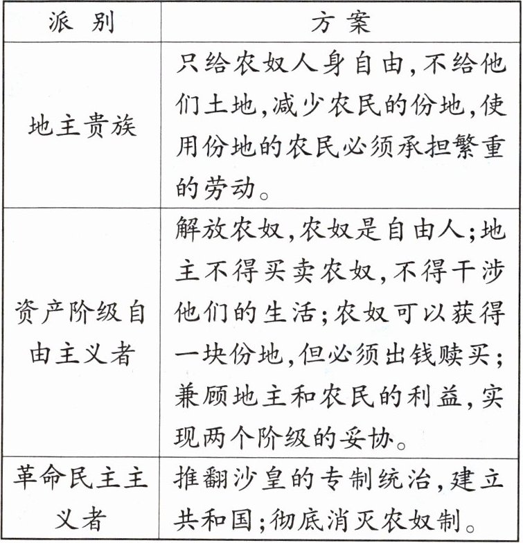(2)派别:资产阶级自由主义者。相同之处:解放农奴,给予其人身自由;农奴可以获得一块份地,但必须出钱赎买。