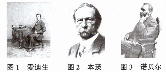 1. 图1:发明电灯。图2:制造出由内燃机驱动的汽车。图3:发明现代炸药。2. 勇于探索、勇于创新、锲而不舍等优秀品质。