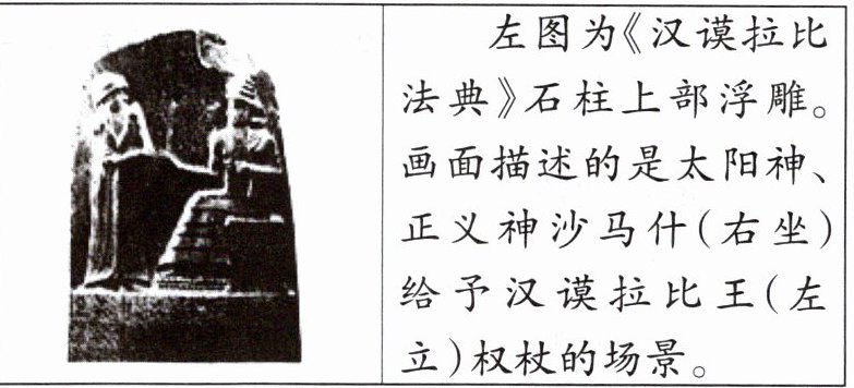〈材料二〉 安努与恩利尔(古巴比伦的神)为人类福祉计,命令我,荣耀而畏神的君主,汉谟拉比,发扬正义于世,灭除不法邪恶之人,使强者不凌弱,使我有如沙马什,照临黔首,光耀大地。