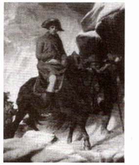 《拿破仑越过阿尔卑斯山》是历史画中的自然主义派画家德拉罗什于 1848 年创作的。画中的拿破仑右手捂着肚子,满脸疲惫,形象憔悴,而且他骑的不是马,而是一头驴,驴累得已经抬不起头。