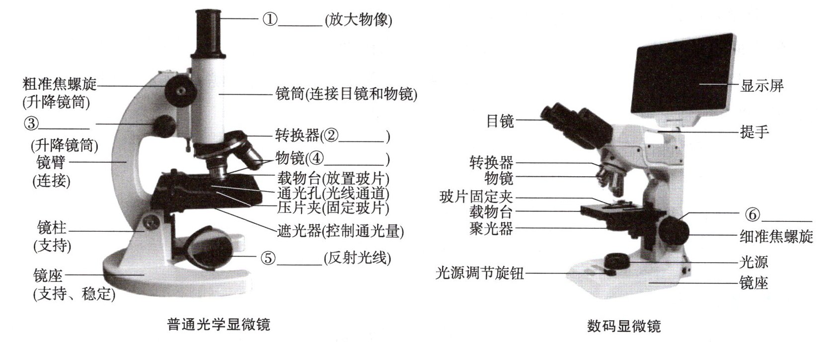 (1)①目镜 ②调换物镜 ③细准焦螺旋 ④放大物像 ⑤反光镜