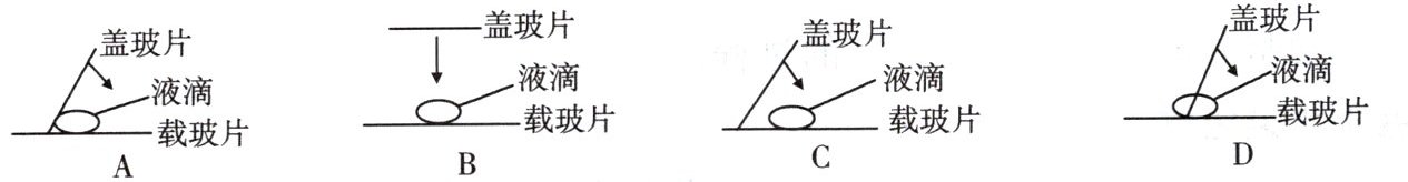 (5) 正确地盖盖玻片是成功制作临时装片的关键。按下图所示方法制作临时装片时最不容易出现气泡的是(箭头代表盖盖玻片的方向)