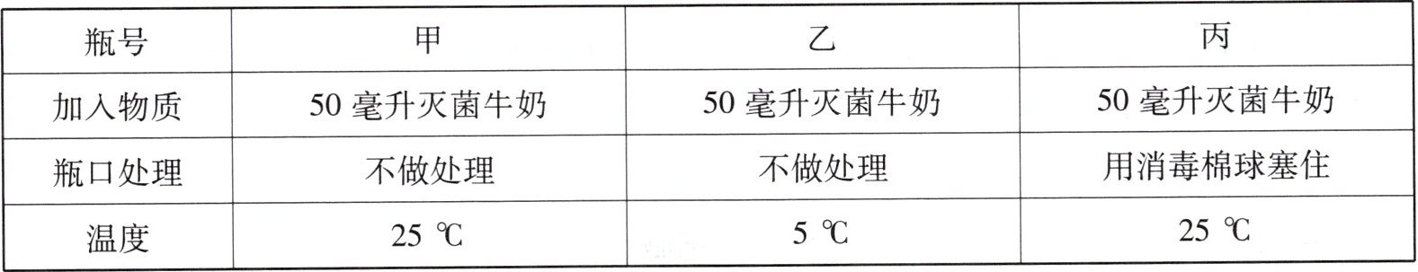 2. 为了探究食品腐败的原因和细菌生存的条件,生物兴趣小组用已消毒的甲、乙、丙3个相同锥形瓶,按下表进行了实验。请分析表中包括了几组对照实验,变量分别是什么。(
