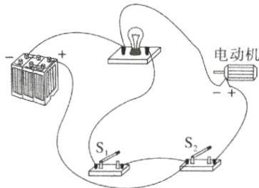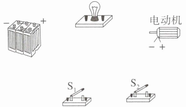 7. 请你将以下元件连接成电路,要求:只闭合 $ S_{1} $ 时灯泡发光,只闭合 $ S_{2} $ 时电动机转动。