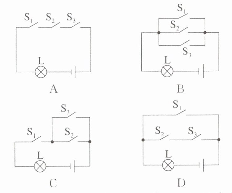 2. 现代智能手机通常支持多种解锁方式,解锁时可任选一种方式。图示电路中, $ S_{1} $ 表示数字解锁开关, $ S_{2} $ 表示图案解锁开关, $ S_{3} $ 表示指纹解锁开关,灯泡 $ L $ 发光表示手机解锁成功,则下列电路中符合要求的是(