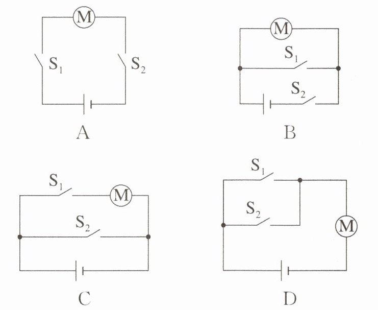2. (2023自贡中考)在高铁站的自动检票闸机口,乘客需刷身份证,同时进行人脸识别,两个信息都符合后闸机门(电动机)才自动打开,检票通过。身份证和人脸识别系统都相当于开关,信息符合后开关自动闭合。下列电路中,符合上述要求的是(