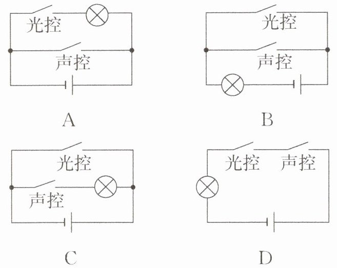 4. 如图所示,某同学设计了一个楼道照明“智能化”电路,即利用“光控开关”(天黑时自动闭合,天亮时自动断开)和“声控开关”(当有人走过发出声音时,自动闭合;无人走过没有声音时,自动断开)来控制灯泡。下列符合要求的电路图是(