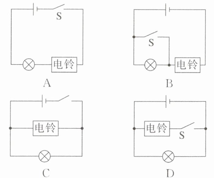 1. (2024天津中考)某兴趣小组要为居家老人设计一个“应急呼叫器”电路,要求:开关断开时,电灯和电铃均不工作;开关闭合时,灯亮铃响,即使电灯因断路不亮,电铃仍可工作。如图所示的电路中,符合设计要求的是(