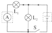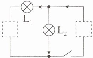 7. 根据图中标出的电流方向,请在图中的两个虚线框内画出“电源”和“电流表”的符号,并满足当开关都闭合时两灯正常工作的条件。