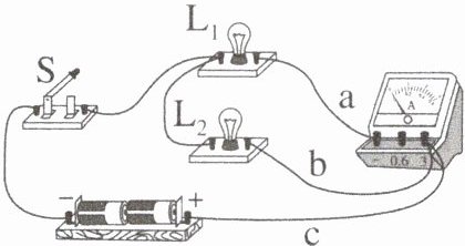 (选填“$ a $”“$ b $”或“$ c $”)的右端接在电流表的“$ - $”接线柱上。(3)如果只将导线 $ b $ 的左端改接在 $ a $ 左端所在的接线柱上,其他接线不变。闭合开关后,则会出现的现象是