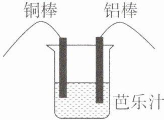 9. (科学探究)果汁也能做电池。如图所示,先向杯中倒入芭乐汁,再把分别接有导线的铜棒和铝棒插入芭乐汁中,作为电池的正、负极,一个芭乐电池就做成了。那么芭乐电池的正极是铜棒还是铝棒呢?给你电流表、电压表、低压发光二极管、开关各一个、导线若干,请选择其中合适的器材设计一个实验方案进行探究。(也可画图辅助说明)