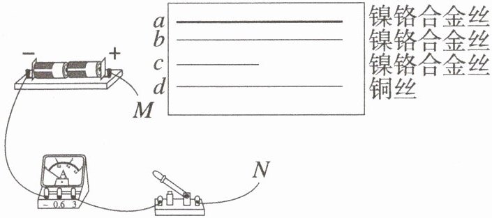 5. 利用如图所示的实验,探究影响电阻大小的因素。a、b、c都是镍铬合金丝,a、b的长度相等,a的横截面积是b的2倍;b、c的横截面积相等,b的长度是c的2倍;d是铜导线,长度和横截面积都与b相同。将导线M、N端分别接a、b、c、d的两端进行实验。如果要探究导体的电阻与长度的关系,应选