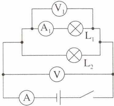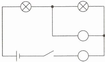 4. 如图所示电路中有两个小灯泡,两个电表(电流表或电压表),在图中圆圈内填入合适的元件,要求开关闭合时两灯均能发光,且两电表的示数均不为零。