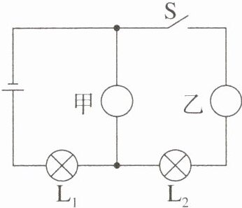 6. (2025 泉州泉港区期末)如图所示电路中,甲、乙是两只电表,闭合开关后,两灯均能发光;断开开关后,两灯均不亮。请在圆圈内填入电流表或电压表的代表符号。