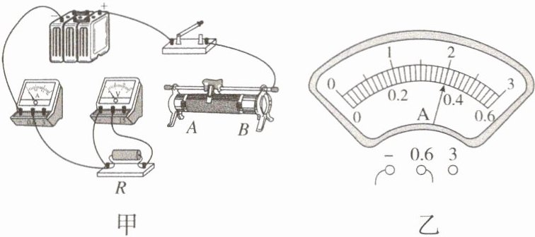 (4) 排除故障后的某次实验中,移动滑片使电压表示数为 $ 2 \, V $ 时,电流表的指针位置如图乙所示,则电流表的示数为______ $ A $,定值电阻 $ R $ 的阻值为______ $ \Omega $。