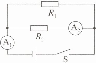 10. (2025洛阳阶段练习)如图所示,闭合开关$S$,两电流表的示数之比为$5:3$,则流过$R_{1}与R_{2}电流之比I_{1}:I_{2}= $