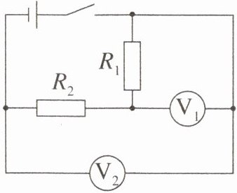 7. 如图所示电路,$V_{1}$、$V_{2}$是相同的电压表,都有两个测量范围$0\sim3V和0\sim15V$。如果闭合开关后,两个电压表的指针偏转角度相同,那么电阻$R_{1}$、$R_{2}$阻值可能是(
