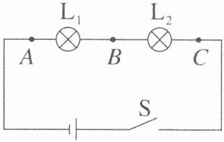 12. 某实验小组用两个相同的小灯泡连接了如图所示的电路,当开关闭合后发现$\mathrm{L}_{1}和\mathrm{L}_{2}$两灯都不亮,为了找到故障原因,小张用一根导线来检查。当导线与$AB$两点连接时,$\mathrm{L}_{1}$灯不亮,$\mathrm{L}_{2}$灯亮;当导线与$BC$两点连接时,两灯都不亮。由此推测故障是(
