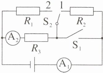 ;当开关$S_{1}$闭合、开关$S_{2}$掷到2时,电流表$A_{1}与电流表A_{2}$的示数之比为2:1