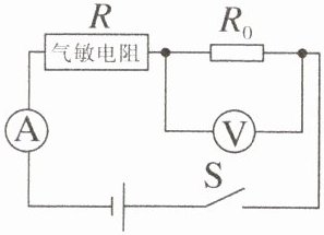 7. (2024鸡西中考)天然气是一种清洁能源,方便居民使用的同时,存在着泄漏的安全隐患。物理兴趣小组在老师的指导下设计了天然气泄漏检测电路,如图电源电压恒定不变,$R_{0}$为定值电阻,$R$为气敏电阻。$R$阻值随天然气浓度的增大而减小,则天然气(