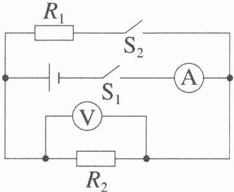 5. (2023益阳中考)如图所示的电路中,电源电压保持不变,$R_{1}和R_{2}$为定值电阻。先闭合开关$S_{1}$,再闭合开关$S_{2}$后,电流表和电压表的示数变化情况是(