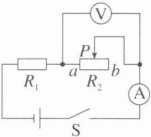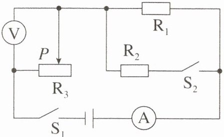 2. 如图所示电路,电阻 $ R_1 = 10 \Omega $,当开关 $ S_1 $ 闭合,$ S_2 $ 断开,滑动变阻器的滑片 $ P $ 移到最右端时,电压表示数为 6 V,电流表示数为 0.3 A;当开关 $ S_1 $、$ S_2 $ 都闭合,滑片 $ P $ 移到最左端时,电流表示数为 1.5 A。求: