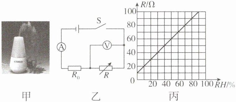 6. (2025 平顶山期中)如图甲所示为一个超声波加湿器,图乙所示为其内部湿度监测装置的简化电路图。已知电源电压为 12 V,定值电阻 $ R_0 = 20 \Omega $,电压表的测量范围为 $ 0 \sim 9 $ V,湿敏电阻 $ R $ 的阻值随湿度 $ RH $ 变化的关系图像如图丙所示。在电路安全工作的前提下,求: