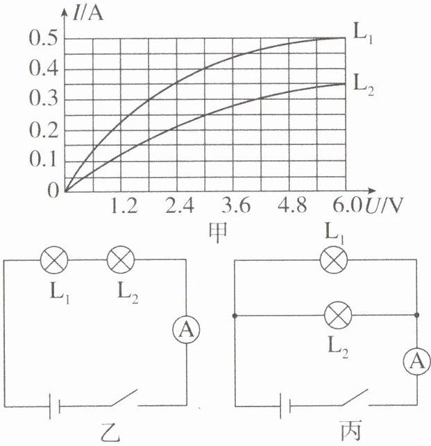 (2)串联电路电源电压等于各用电器电压之和,所以电源电压为$U=U_{1}+U_{2}=1.8\ V+4.2\ V=6\ V$,并联电路支路电压等于电源电压,由图甲可知,当电压为6 V时,经过$L_{1}$的电流为0.5 A,经过$L_{2}$的电流为0.35 A,电流表测量干路电路,故电流表的示数为$I'=I_{1}+I_{2}=0.5\ A+0.35\ A=0.85\ A$。