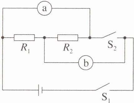 4. (2024天津中考) 如图所示的电路中电源电压不变,a、b为同种电表(电流表或电压表)。闭合$S_1$和$S_2,a、$b两表示数分别为3和1(单位为A或V);将a、b换为另一种电表,闭合$S_1、$断开$S_2,a$表示数为0.4(单位为A或V)。则(