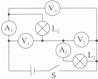 3. (2024南充中考) 如图,开关$S$闭合后,电流表的示数分别为$I_1$、$I_2$,电压表的示数分别为$U_1$、$U_2$、$U_3$,$L_1的电阻小于L_2$的电阻,则下列关系中正确的是(
