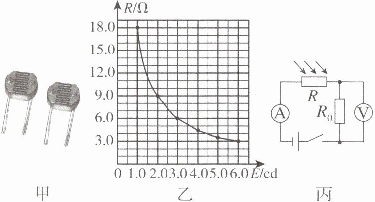 4. (科学思维)如图甲所示的光敏电阻,其阻值 R 随光强 E[光强是表示光的强弱程度的物理量,照射光越强,光强越大。光强用符号 E 表示,国际单位为坎德拉(cd)]的变化关系如图乙所示。把它接在图丙所示的电路中,其中 R 是光敏电阻,R₀ 是定值电阻。