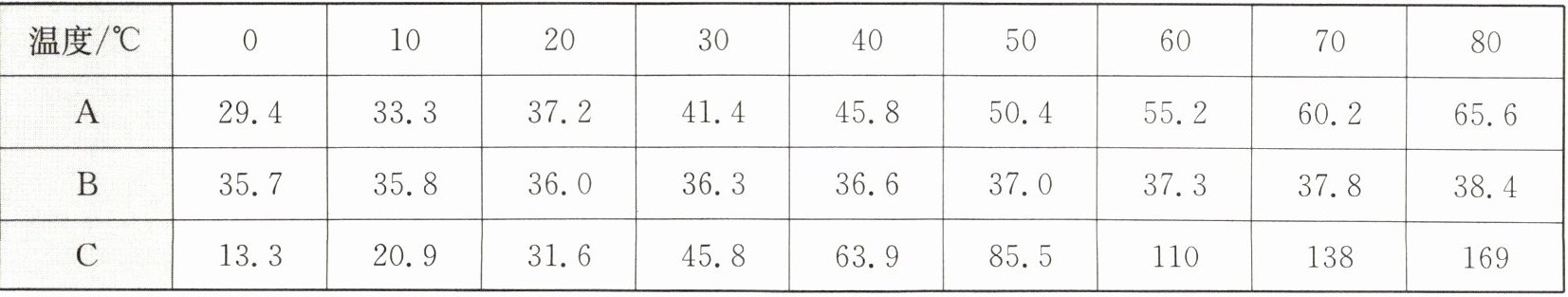 18. $ \mathrm{A} $、$ \mathrm{B} $、$ \mathrm{C} $ 三种物质在不同温度下的溶解度(单位:$ \mathrm{g} $)如下表所示。根据表中的数据,回答有关问题。