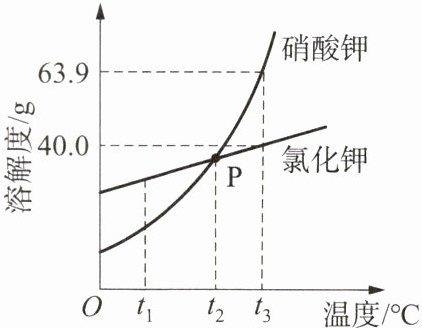 (3)$t_2$℃时,硝酸钾和氯化钾的溶解度相等
