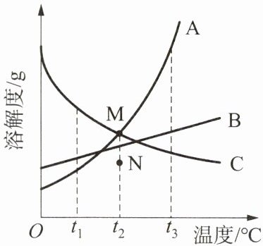 (5) $ t_{2}^{\circ} \mathrm{C} $ 时,$ \mathrm{N} $ 点处 $ \mathrm{A} $ 的溶液呈(填“饱和”或“不饱和”)状态,要使该溶液从 $ \mathrm{N} $ 点的状态变为 $ \mathrm{M} $ 点的状态,可以采取的措施有或。