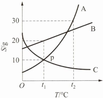 (填“A”“B”或“C”)物质的溶液。(4)对于溶解度曲线上的点$p$,以下描述中一定正确的是